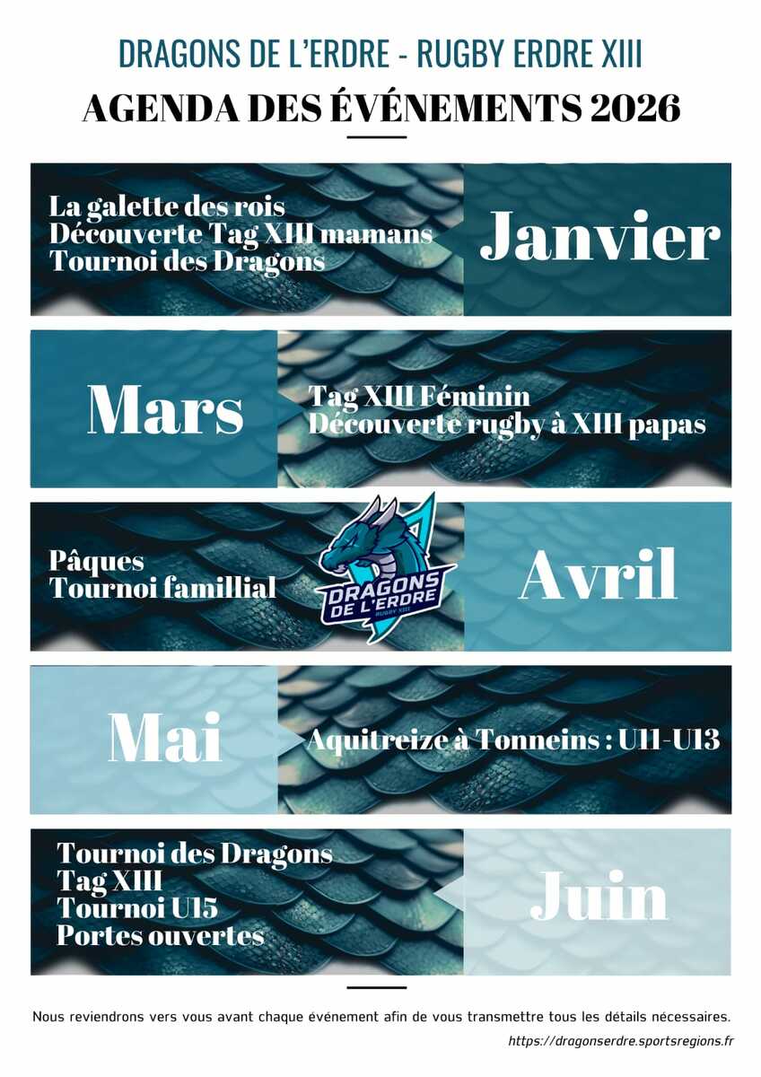 Découvrez dès maintenant l’agenda des événements 2026 du club Dragons de l’Erdre – Rugby Erdre XIII !